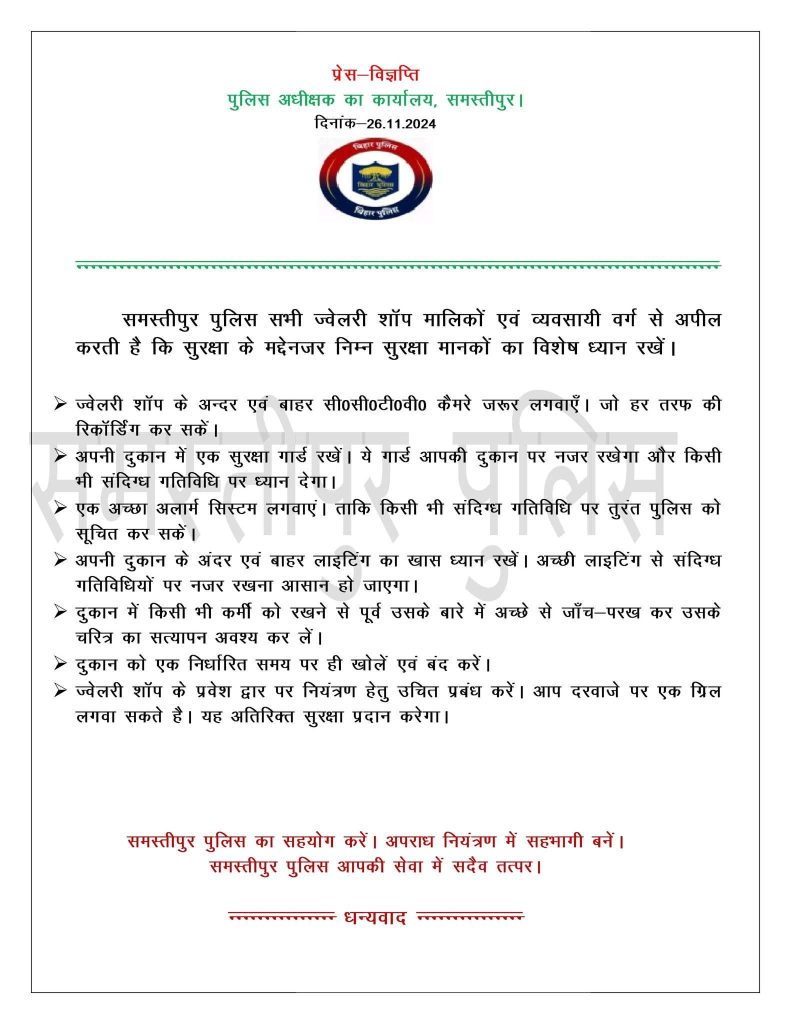 Doorbeen News Desk: समस्तीपुर पुलिस सभी ज्वेलरी शॉप मालिकों एवं व्यवसायी वर्ग से अपील करती है कि सुरक्षा के मद्देनजर निम्न सुरक्षा मानकों का विशेष ध्यान रखें।