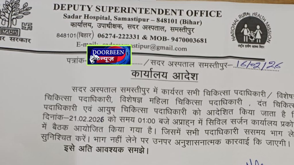 इस मामले में सदर अस्पताल समस्तीपुर डीएस डॉ गिरीश कुमार ने अस्पताल में कार्यरत सभी चिकित्सा पदाधिकारी / विशेषज्ञ चिकित्सा पदाधिकारी, विशेषज्ञ महिला चिकित्सा पदाधिकारी दंत चिकित्सा पदाधिकारी एवं आयुष चिकित्सा पदाधिकारी को आदेशित किया जाता है कि 21 फरवरी को समय 01:00 बजे अप्राह्न में सिविल सर्जन कार्यालय प्रकोष्ठ में बैठक आयोजित किया गया है। जिसमें सभी पदाधिकारी ससमय भाग लेना सुनिश्चित करें। भाग नहीं लेने पर उनपर अनुशासनात्मक कारवाई कि जाएगी।