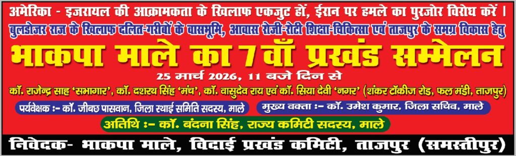 Doorbeen News Desk: 25 मार्च को ताजपुर प्रखंड फलमंडी में आहूत भाकपा माले का प्रखंड सम्मेलन का तैयारी जोरों पर है। सम्मेलन में बड़ी भागीदारी दिलाने के उद्देश्य से जगह-जगह शाखा, पंचायत एवं लोकल कमिटी की बैठक हो रही है। सम्मेलन के लिए पर्चा, पोस्टर, झंडे-बैनर आदि की तैयारी जारी है।