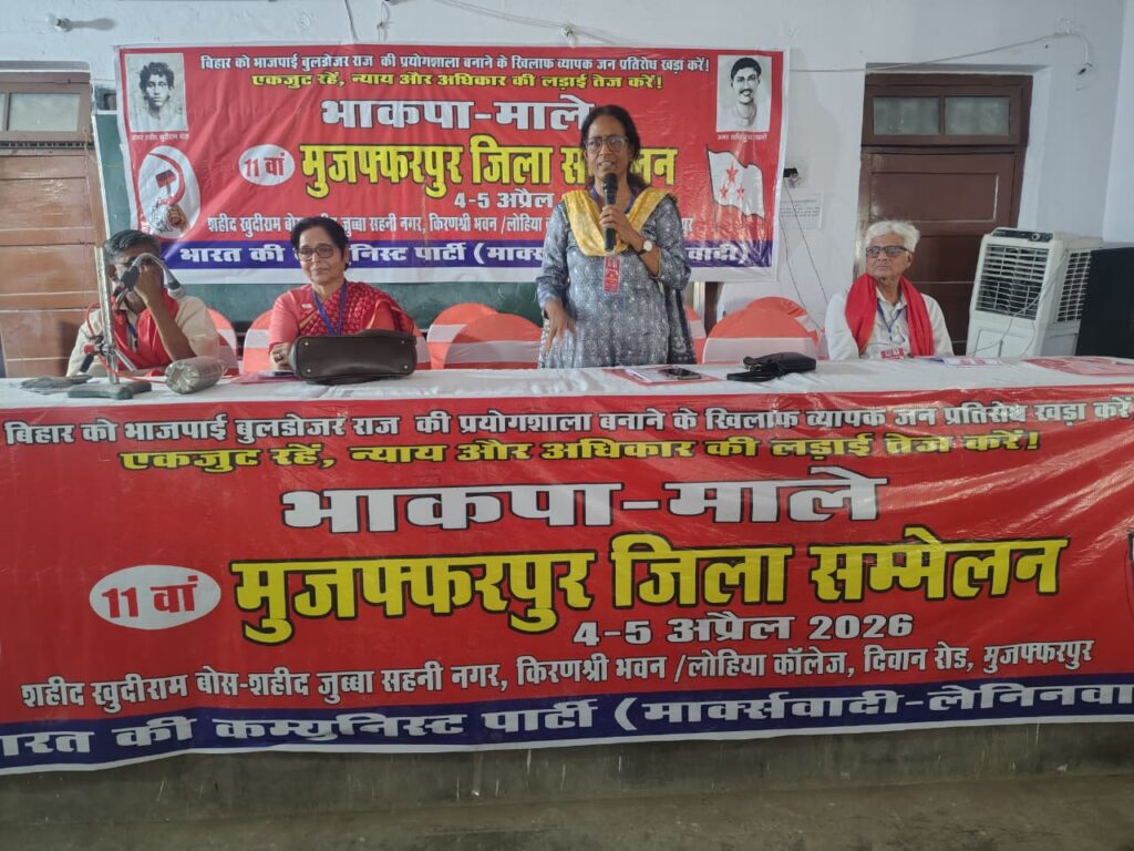 मुजफ्फरपुर: कल से शुरू भाकपा माले का ग्यारहवां जिला सम्मेलन आज लोहिया कॉलेज में संपन्न हुआ। जितेंद्र यादव, शत्रुघ्न सहनी,रामनंदन पासवान, रामबली मेहता, विश्वकर्मा शर्मा, वीर बहादुर सहनी,मंजू देवी, रानी प्रसाद और मंजू देवी के अध्यक्ष मंडल ने सम्मेलन का संचालन किया।