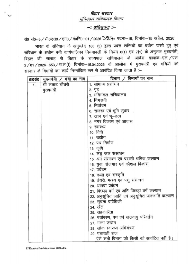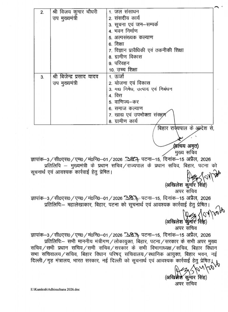 सम्राट कैबिनेट का बंटवारा हुआ, मुख्यमंत्री सम्राट चौधरी के पास 29 विभाग है जबकि डिप्टी सीएम विजय कुमार चौधरी के पास के पास 10 विभाग आया है, जबकि डिप्टी विजेंद्र प्रसाद यादव के पास आठ विभाग हैं ..
